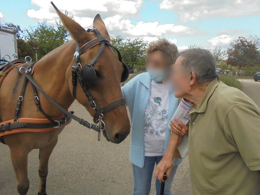 En plus du charme d’un mode de transport traditionnel revisité qui suscite l’étonnement et l’émerveillement, la présence de notre ravissante mule, Savane, réjouit et stimule, révélant des capacités d’interaction parfois inattendues, ravivant pour certains quelques souvenirs ou sensations familières.