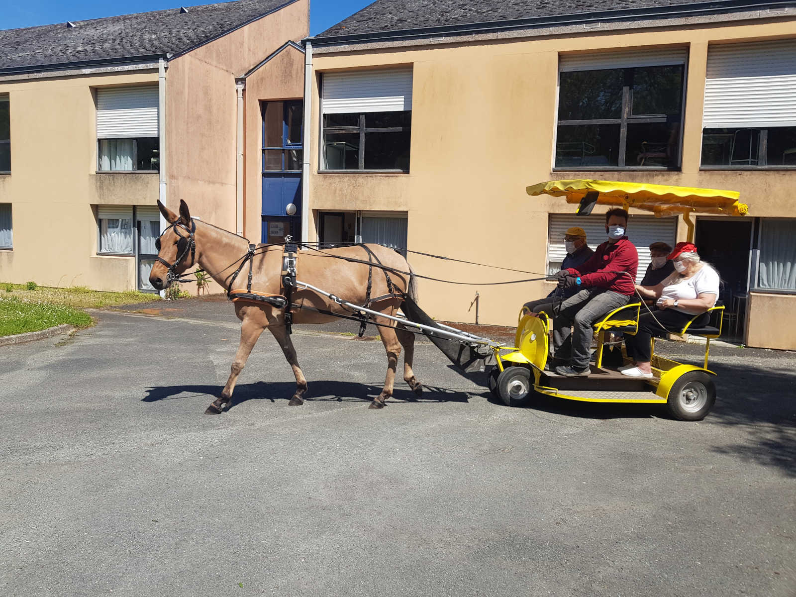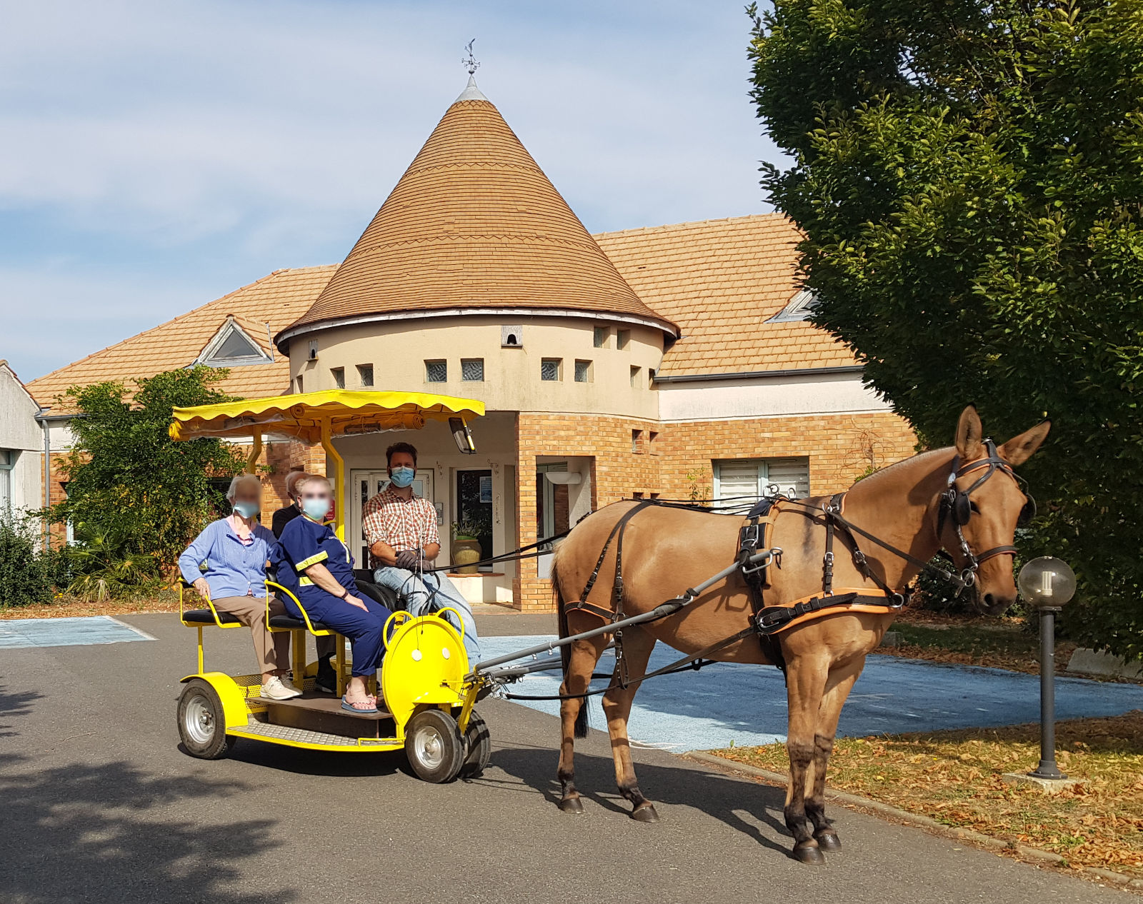 - Une calèche unique avec un accès facilité, complétée si besoin par un dispositif de bâches imperméables pour assurer le confort des bénéficiaires quelle que soit la météo.